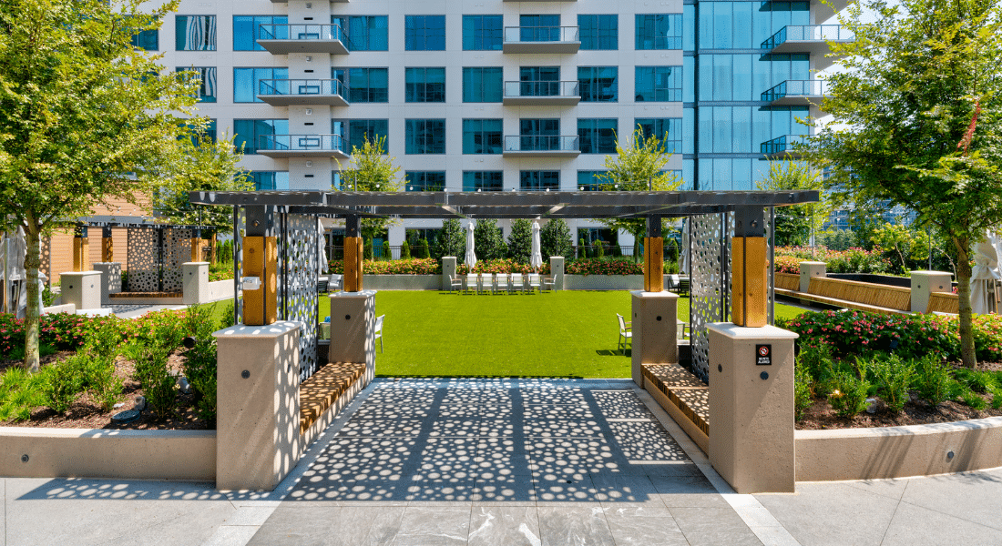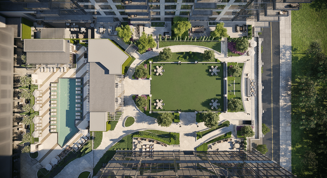 The park will also accommodate nighttime events with spectacular lighting effects for office parties and residents use 24/7. The first floor condo owners enjoy their own outdoor patios with fireplaces and dining, while being able to watch park activities. A large activity space complete with grills, televisions, art walls, and fire pit is provided to the condos general owners.